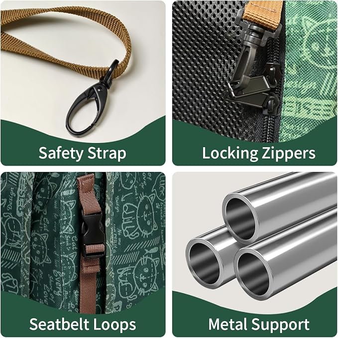 - SAFETY DESIGN- Each access has a zipper lock to prevent cats from escaping. On the side have seatbelt loops, can fix the carrier in the car. The internal metal support structure may also provide good protection for pets.