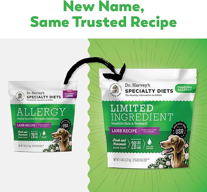 - Feed your dog the way nature intended. Dr. Harvey's Limited Ingredient is a complete meal that designed to support dogs with skin, stomach & environmental sensitivities. This human-grade dog food for dogs with allergies combats canine vulnerabilities from the inside out with premium and balanced superfoods, and is minimally processed with raw lamb as the first ingredient.