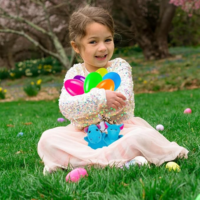 - COLORFUL PACK: 12 different mini stuffed animals with 12 plastic Easter eggs(2.4"X3.4") of 6 colors. Rich and colorful Easter basket stuffers and party favors for kids and adults. Great prefilled easter eggs to celebrate Easter.