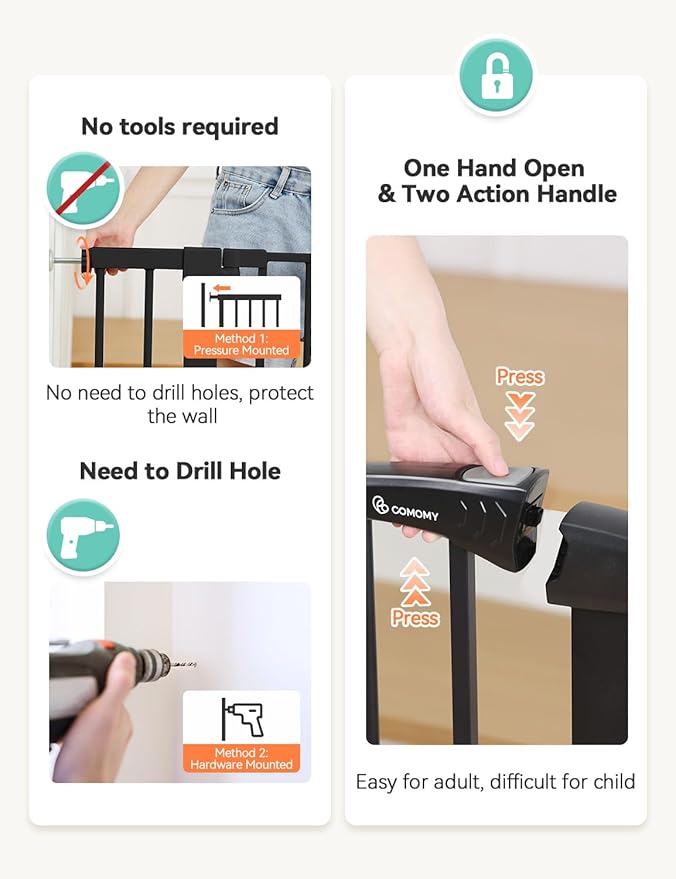 - Enhanced Security Feature: With upgraded safety features, the baby gates for doorways features a double-lock system that requires two buttons to be pressed for it to open. This ensures no accidental openings by either your baby or pets. Notice: Do not cut off the zip tie on the pet gates for dogs before installation is completed, or the gate will completely broken and is unusable.