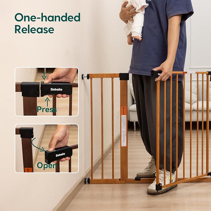- AUTO-CLOSE FEATURE — For added hands-free convenience, the child gate is equipped with an auto-close feature that when the angle is less than 90 degrees, the gate will automatically close and stay open at angles greater than 90 degrees.Adults can easily open using one hand but it is difficult for babies.