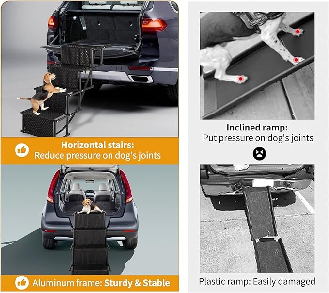 - Easy to Use and Multi-Functional: Our 4-step dog ramp for car are versatile and easy to use. They are perfect for your dog's entry or exit from cars, sedans, SUVs, minivans, trucks, beds, couches, grooming or vet tables, and can even be used in vehicles with side entry (with an opening of 20" or more). When not in use, these car dog ramps conveniently fold up for easy portability and storage
