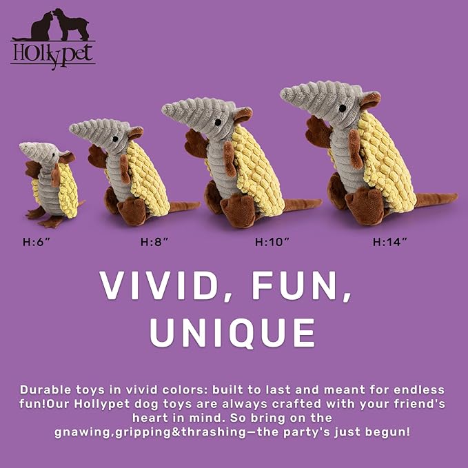 - Unique Sound - Hollypet Armadillo Squeak Toys (except 6 inch) make a sound that's not high pitched, but rather a unique and funny grunt sound that your furry friend will love. Unlike noisy bones, ropes, or other normal stuffed plush dog toys