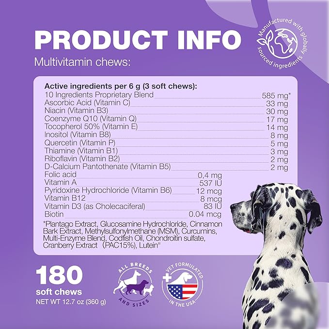 - QUALITY INGREDIENTS: Made with MSM, Quercetin, Vitamins A, D3, B12 and enzymes, our dog multivitamin ensures high-quality supplement. These dog treats provide the necessary vitamins and minerals to support your dog's overall health and vitality.