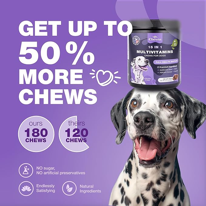 - 15 IN 1 DOG VITAMINS: Our Dog Multivitamin Chews are packed with essential nutrients to support your dog's overall health. These dog multivitamin chews provide comprehensive dog vitamins and dog immune support to ensure your pet's well-being.