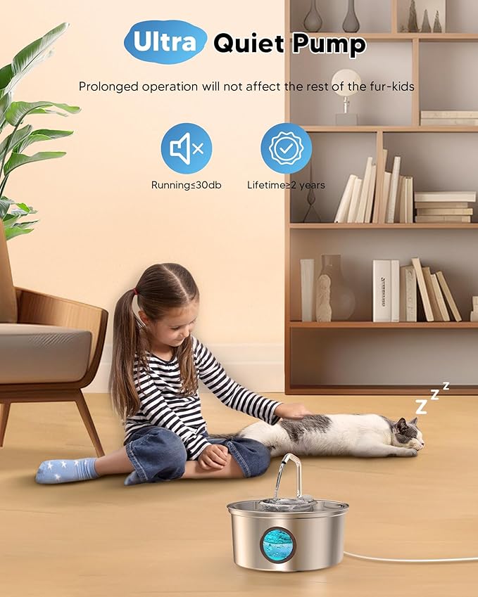 Dog Water Fountain Stainless Steel - 3.2L/108oz Dog Fountain and Removeable Suction Dog Bowls, Kitty Fountain with Multi-Filter, Water Level Window, Pet Fountain for Cats and Dogs