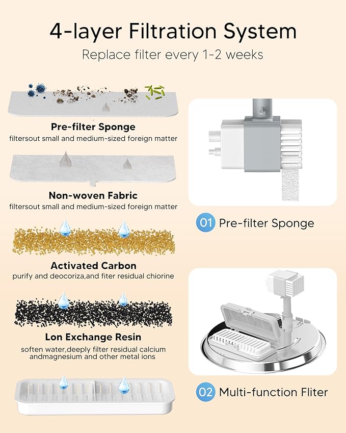 - Delivers Pristine, Refreshing Water: Our multi-stage filtration system, encased in high-density fabric, incorporates silver and coconut shell activated carbon, alongside a unique composite scale inhibitor. This combination ensures that your pets always enjoy clean, fresh, and great-tasting water.