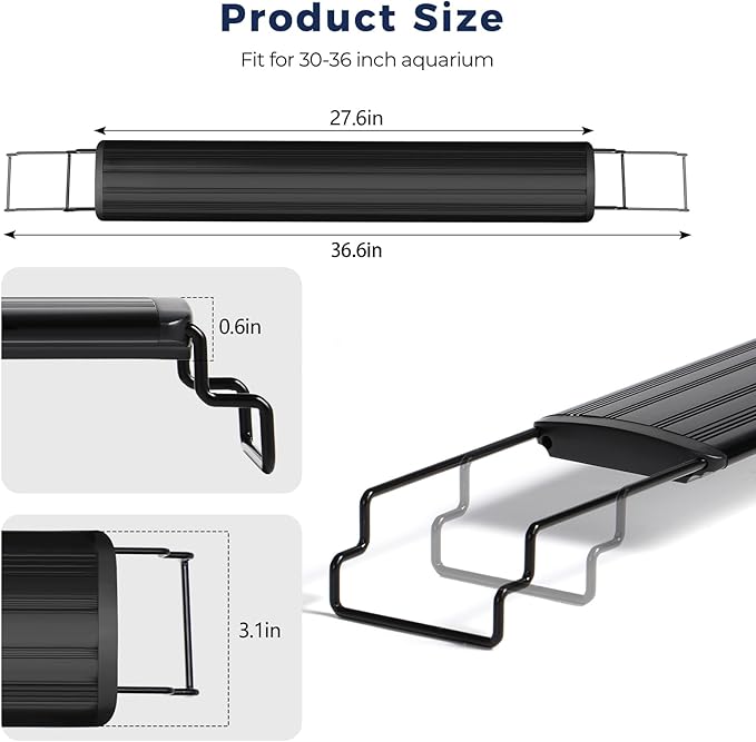 - 【Waterproof + Adjustable Bracket】IP68 waterproof rating, safe to use; the LED fish tank light housing is made of thickened aluminum for better heat dissipation. The telescopic bracket can be stretched from 27.6-37.4 inches, which is very suitable for aquariums from 30-36 inches