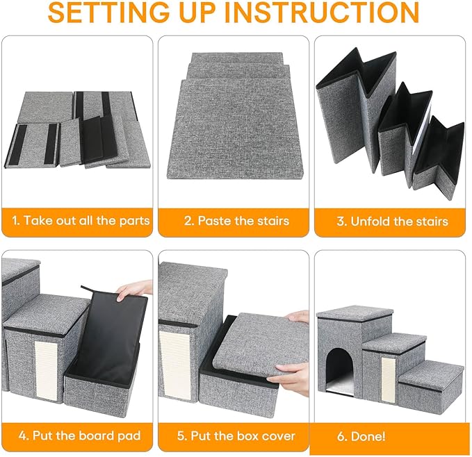 - 【STORAGE & CONDO】Combine the pet stairs, cozy condo, storage space, and cat scratcher in one. The first 2 steps of the pet stairs are designed as a storage box where you can put dog toys, food, clothes, or other pet supplies. The third step can be used as a condo for cats or puppies. There is also a cat scratcher for your cats.