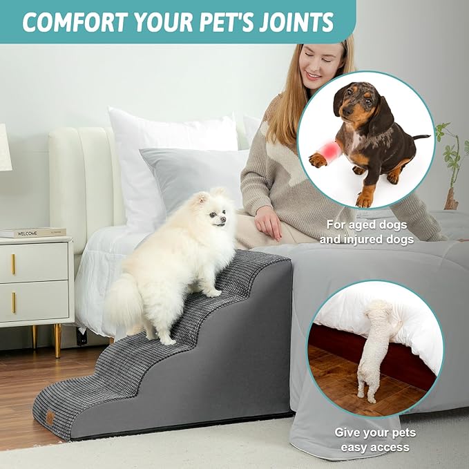 - HIGH DENSITY SPONGE: Foam dog stairs can support up to 80 pounds. Stairs for dogs to get on the bed adopt 30D high-density pure sponge, which provides better support, reducing the pressure on the joints when pets repeatedly jump on high bed, sofa, couch and car. The stairs are covered with high-quality corduroy to provide additional stability