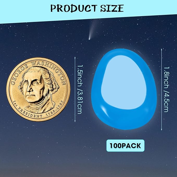 - Large Quantity and Size for Versatile Usage: our package comes with 100 pieces of glow in the dark pebbles, which is more than enough to meet your decorating needs; Each glow rock is about 1.8 inches in diameter, making it an ideal size for multiple applications; Total weight is approximately 1600g/3.53lbs; Whether you're sprucing up a fish tank, designing a walkway, or embellishing a plant flower bed, these fish tank stones are suitable for adding an enchanting touch to your space