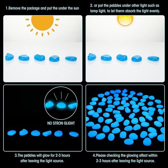 - Simple to Use: our glow in the dark stones are user friendly; Simply expose these glow rocks to light so they can absorb and store it; When it gets dark, they emit a blue glow for several hours, gradually dimming as the night goes by; If they stop glowing, have them absorb light again, and they're ready to illuminate your space once more