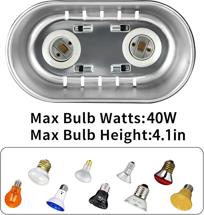 - 【Dual Lamp Fixture&Max 40 W】:The reptile lamp fixture can be matched with two bulbs at the same time and each socket can bear max 40W. Suitable for various types of heat lamp for reptiles (heating lamps, ceramic heating lamps, UVB reptile lamps, daylight lamps and nightlight lamps).In addition to the two 60W heating lamps supplied with the fixture, you can also freely exchange bulbs with heights and widths within 4 inches based on your actual usage needs.