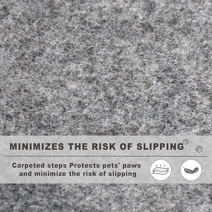 - ๐ก๏ธ Security and Stability: Constructed from high-grade wood, our pet stairs provide strength and reliability. The back brace structure ensures well-balanced stability, and ribbed rubber at the bottom of each frame piece prevents slipping on floors. Carpeted steps and fabric-covered surfaces offer added comfort and safety by preventing paws from slipping, giving your pet a sturdy and secure climbing experience.