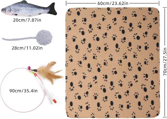 - INTERACTIVE CAT TUNNEL CAT TOY SET: Contains a uniquely designed long cat tunnel, sturdy track spring cat toys, cat teasing sticks, simulated plush fish, wool balls, resting blankets and other elements to create an interesting environment for cats environment