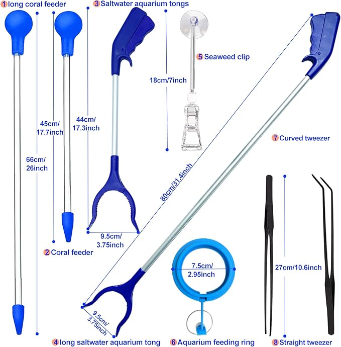 - Aquarium reef grabber kits contain:1pcs 31.5Inch Aquarium coral reef Grabber,1pcs 17.3Inch aquarium reef grabber,1pcs 18.3Inch coral feeder,1pcs 26Inch coral feeder,2pcs 10.6Inch aquarium tweezers,1pcs 2.95Inch aquarium feeding ring,1pcs 7Inch aquarium veggie clip