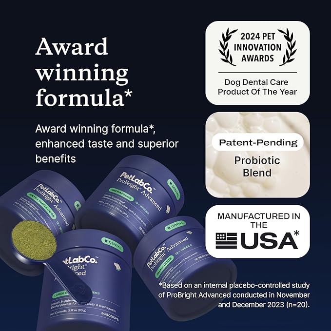 - Award-Winning, Clinically Tested* Formula - ProBright Advanced is the dog dental care product of the year—now with a new flavor, superior ingredients, and a clinically tested formula. In just 28 days, daily use was shown to significantly reduce bad breath–causing compounds. Say goodbye to toothpaste, brushing battles, and dental sticks. Say hello to ProBright—advanced, effortless oral care at its best
