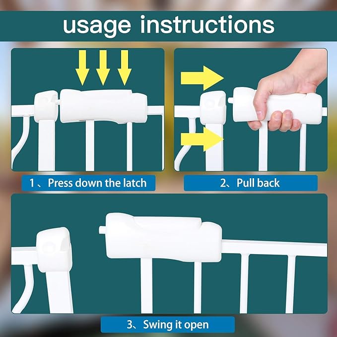 - Double Locks System-The extra wide baby gate pressure mounted handle design makes it easy for adult to open: simply press the button, lift up the walk thru baby gate to open the door with single hand. But it is difficult to open it by little kids. Ultra-secure, a double-locking option up and down design to ensure the large baby gate is securely installed for optimal security.