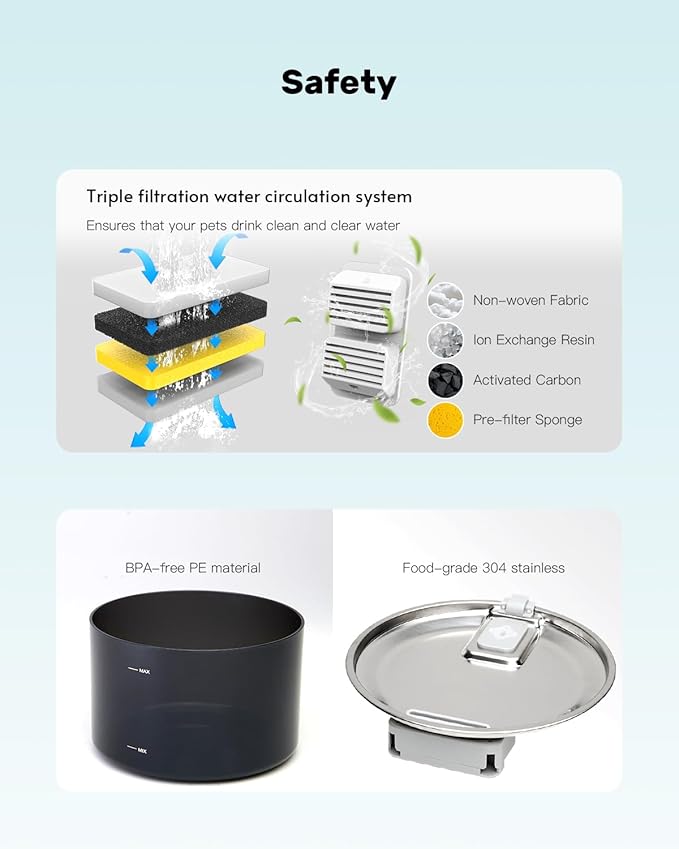 - Vividorama cat water fountain boasts a 101oz water capacity, ensuring extended use without frequent refills, making it ideal for homes with multiple pets.