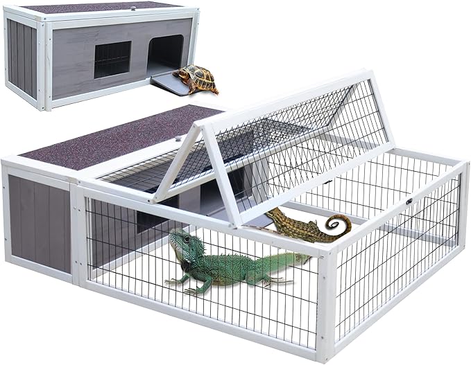 Tortoise House Habitat Wooden with Waterproof Cover, Chicken Coop with Run Rabbit Hutch Small Animal Hutch Enclosure Indoor/Outdoor-Grey + White Trim