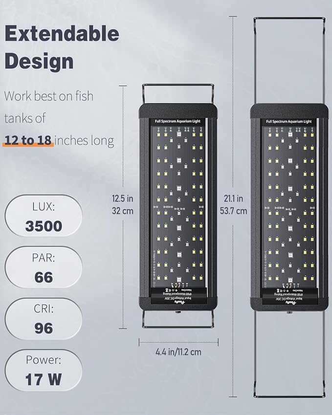 - For 12" to 18" Tanks: With an extendable bracket (min length: up to 12.5"; max length: up to 21.1"), the LED aquarium light always stays steady on the fish tank. Work best on tanks of 12 to 18 inches long.