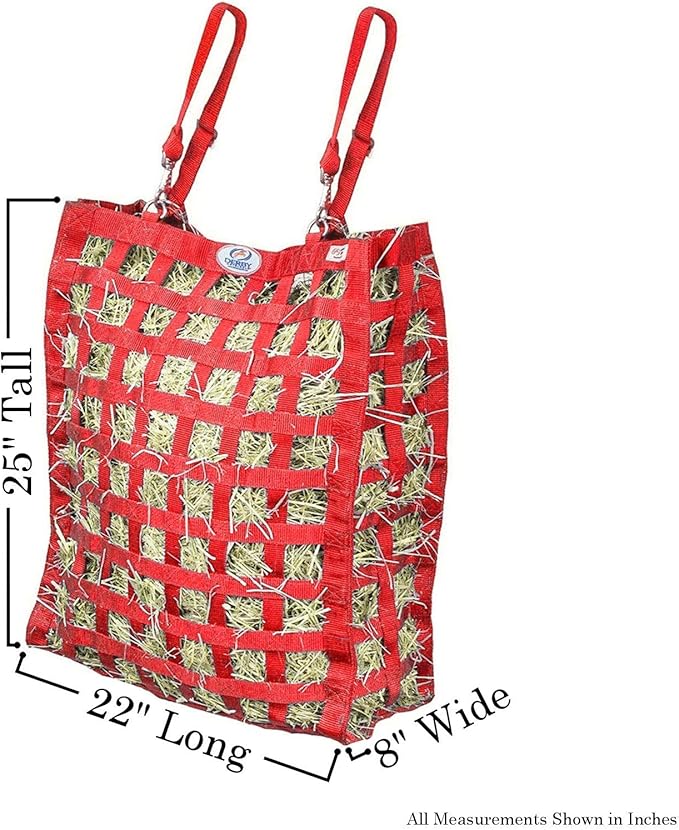 • HOLDS 2-3 FLAKES OF HAY - this 22x8x25" hay bag with 1.75" square openings holds approx. 2-3 flakes of Timothy, Orchard, Alfalfa, or any other type of hay. Our hay bags were designed to minimize frustration and can be stuffed in seconds.