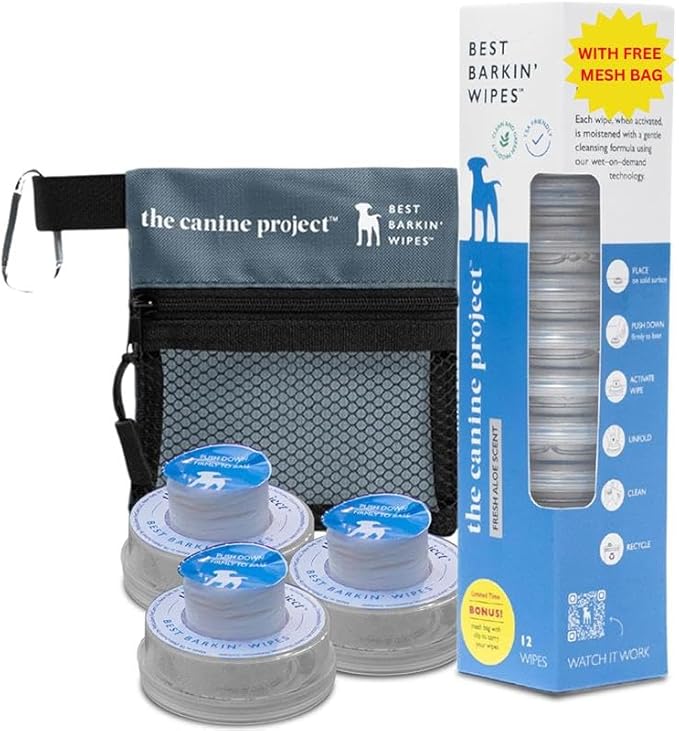 Best BARKIN' Wipes with Free Mesh Bag - Dog Wipes for Paws Ears and Butt - Micellar Aloe Scented Travel Friendly Puppy Wipes (12-Pack)