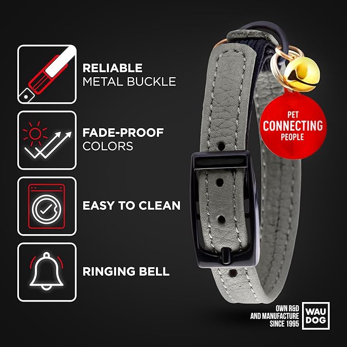 Leather Cat Collar with Bell & Elastic Strap - Pet Collar Leather - Leather Kitten Collar - Cats Small and Big Cat Collar for Boy Cats, Girl Cats with Safety Elastic Strap (Gray, 6" - 8")