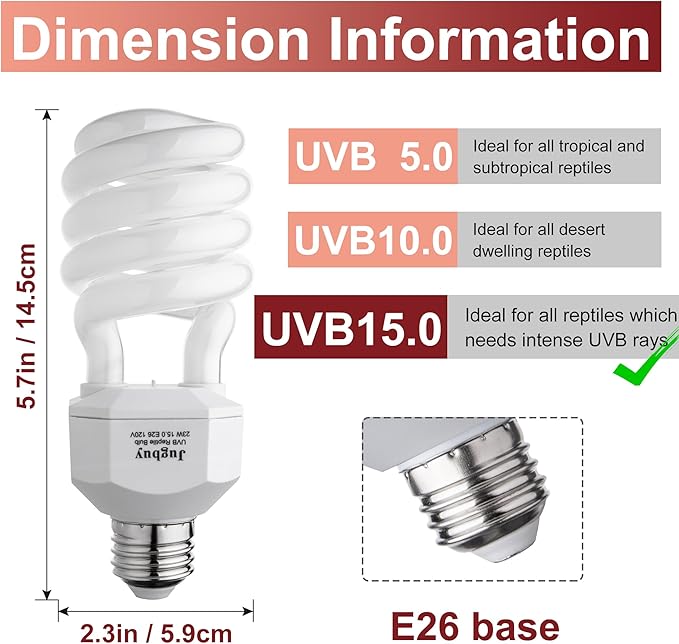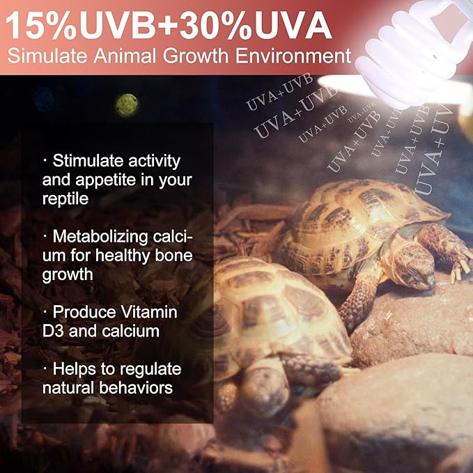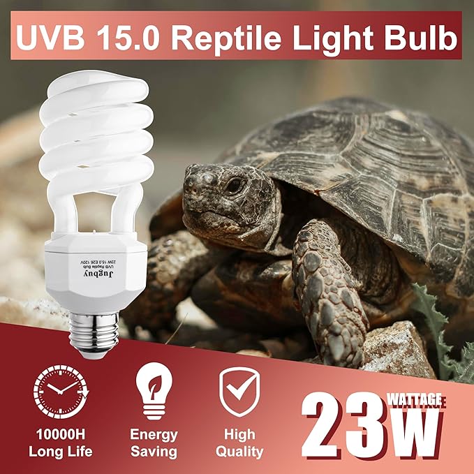 - [Simulate Amphibians Environment] The UVB output will stimulate activity and appetite in your reptile, metabolizing calcium for healthy bone growth while in captivity. Jugbuy 23-Watt Reptile Light Bulb provide necessary UVB rays to keep them healthy. In addition, UV Light Bulbs also provide the necessary UVA light which helps to regulate natural behaviors, including feeding, daily activity and movement, mating and similar activities.