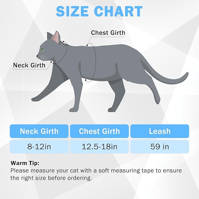 - ADJUSTABLE: The length of the rope can be adjusted by the button on the rope. This harness is adjustable, with a neck circumference of 8 "-12", a chest circumference of 12.5 "-18", and a leash of 59 ", suitable for most cats, but not suitable for kittens and ultra-small cats. Small animals such as rabbits are also suitable.