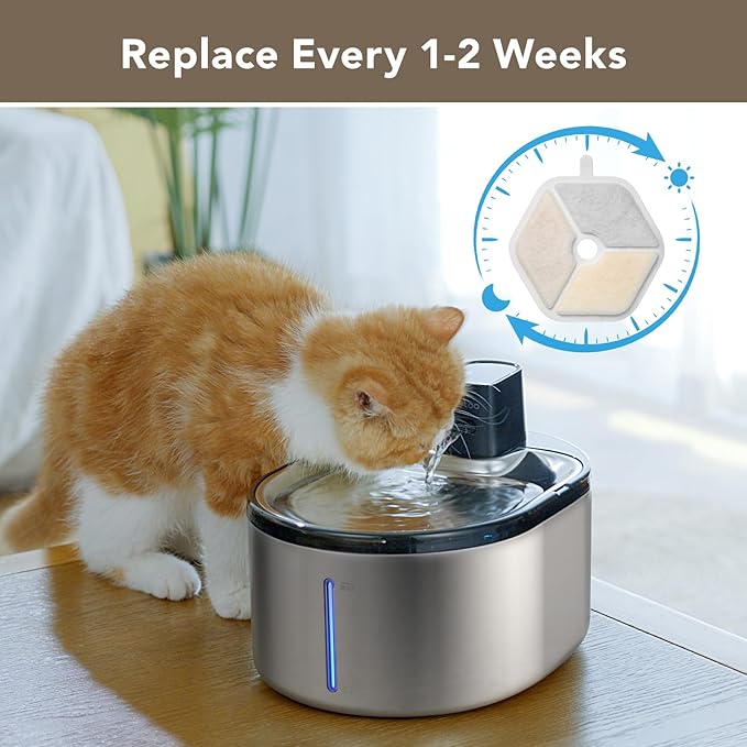 - For Optimal Use: Soak the filter for 5 minutes and rinse for 30 seconds before use. To maintain the filtering effect, recommended to replace the filters every 1-2 weeks. If you have multiple pets, it is recommended to clean the fountain and change the filter more often.