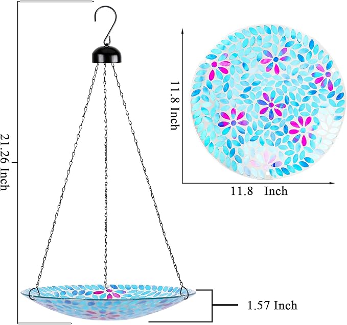 - Mosaic Handmade: Crafted from durable mosaic and metal materials, this mosaic birdbath is perfect for hanging in your garden or yard. The flower design adds a touch of elegance to your outdoor space, while providing a refreshing spot for birds to use