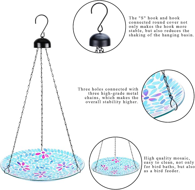 - Easy To Use & Clean: Simply fill the mosaic bowl with water or food, and hang it outdoors to attract birds to enjoy. The mosaic birdbath is easy to clean and store, making it a convenient addition to your outdoor space