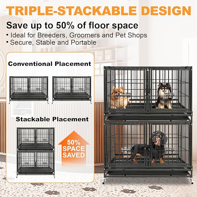 - Save Space, Keep Your Home Neat and Clean: Each stackable dog crate measures 42.5"L x 28"W x 30"H (the interior height: 22.5 inches) and can be stacked to Two tiers high(42.5"L x 28"W x 57"H), making your house cleaner and more organized— A rare design in the market that ideal for multi-pet households, breeders, kennels, multi-pet households, pet hospitals, and groomers. The screw-fixed design ensures stability and safety when stacking, maximizing vertical space while maintaining comfort for your dogs