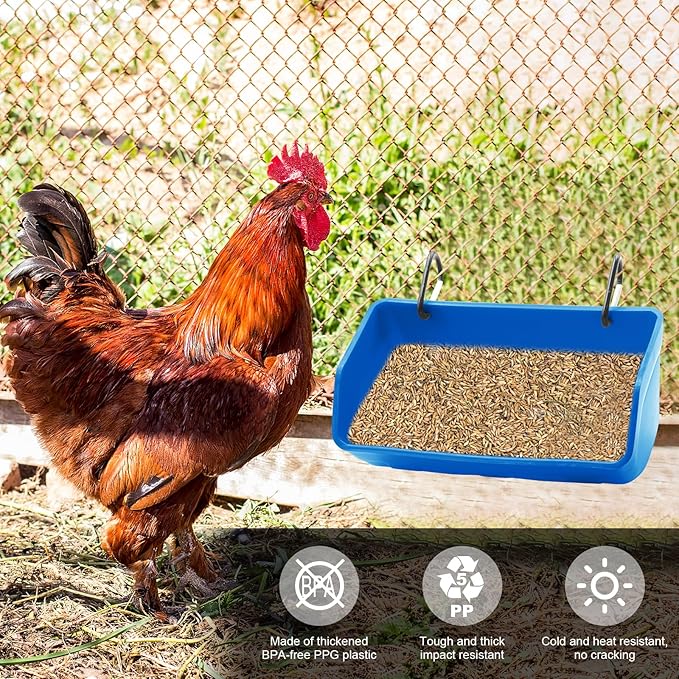 Fence Hanging Chicken Feeder - 4 Pack Feed Trough with Clips for Goat Duck Sheeple Horse Goose, Pig Poultry, Chicken Feeder Bucket Feeding Container for Livestock (Blue)