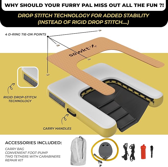 - Durable construction: The Dog Dock is made with dropstitch construction, which creates a rigid feel when inflated for unmatched stability. It also has a full cover of EVA traction pad for a comfortable and non-slip launch pad.
