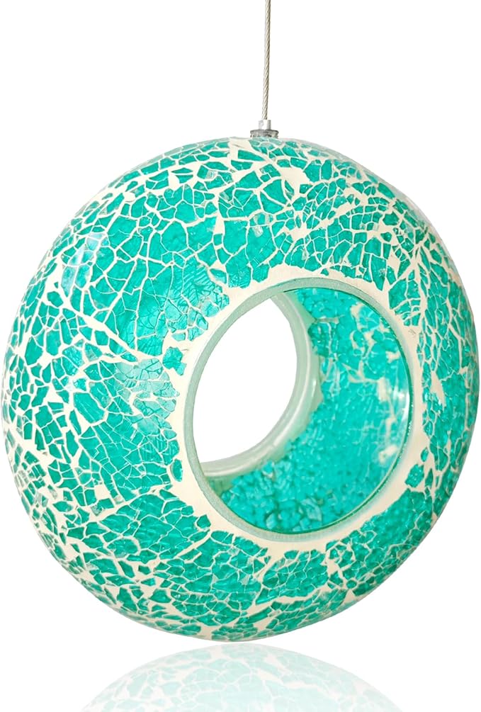 - Mosaic Design: This mosaic bird feeder with a hanging wire so you can easily hang the feeder outside to brighten up your backyard, patio, lawn, deck, or balcony. This outside feeder is made of glass and features a colorful mosaic pattern