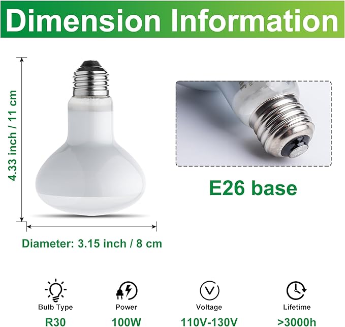 - [4 Pack Reptile Heat Bulb] Power: 100W, Voltage: 110V-130V, Lifetime: >3000h, Socket: medium E26 standard base, Length: 4.33 inch / 11 cm, Diameter: 3.15 inch / 8 cm