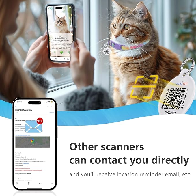 - [RECEIVE INSTANT EMAIL] It is not a GPS tracker, but if someone scans your cat tag, you will instantly receive the GPS coordinates and address of the scanned location, enabling you to quickly locate your beloved pet! Free online pet page prevent lost, No Subscription or Any Other Fees!