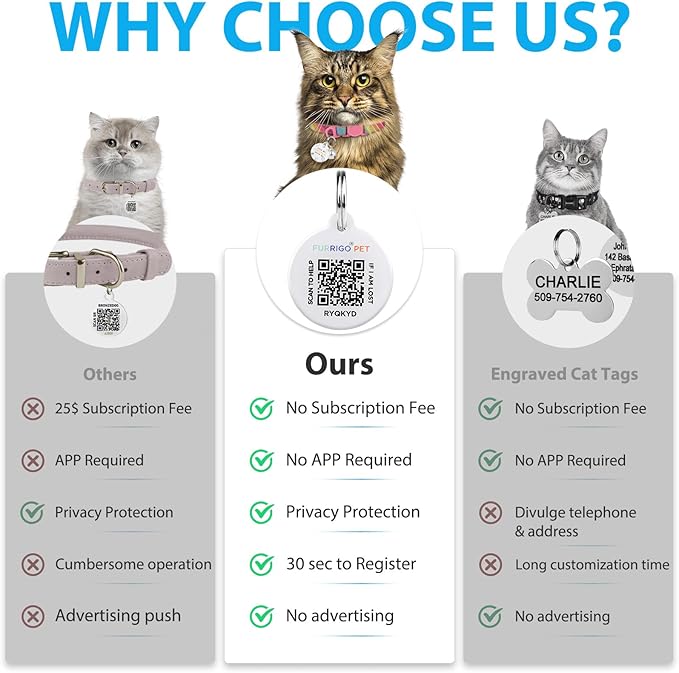 - [PERSONALIZED CAT TAGS] Non-Fading Laser Engraved QR Code. Scan the QR code to activate, links to free pet profile page, and enter your emergency contact and cats Info etc. Anyone who finds your pet can access your pet's profile and contact you to return it home. NO APP REQUIRED!