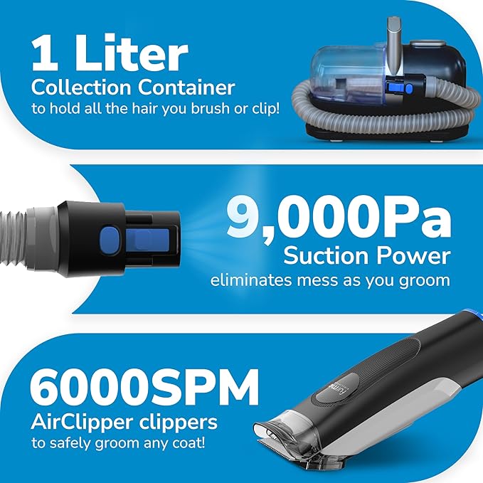 - MESS-FREE: With 9,000Pa suction power, the pet grooming vacuum captures 99% of cat & dog hair and dander, eliminating the need to clean up afterward. The 1-liter collection bin of pet vacuum holds all the pet hair for a mess-free grooming session.