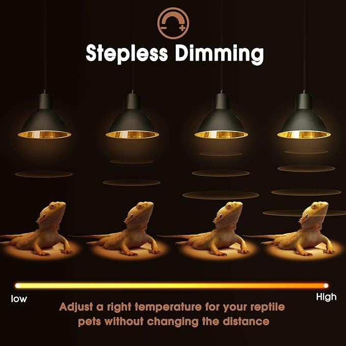 - Dimmable Heat Lamp: Easily adjust the tank temperature without changing the lamp's distance. The stepless dimming function makes it simple to set the perfect temperature for your reptile pets.