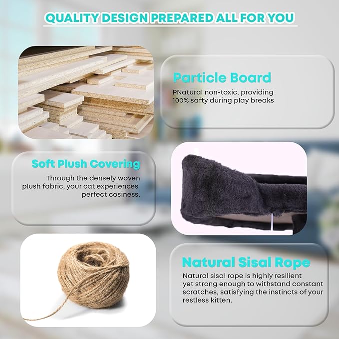 - 🐱 【Posts for Scratching Covered in Sisal 】These are scratching surfaces that are integrated into the framework. Cats love to bury their claws in sisal because it's a sturdy substance with a coarse texture. Our cat tree promotes healthy scratching habits and helps discourage cats from damaging furniture by offering dedicated spaces for them to scratch.