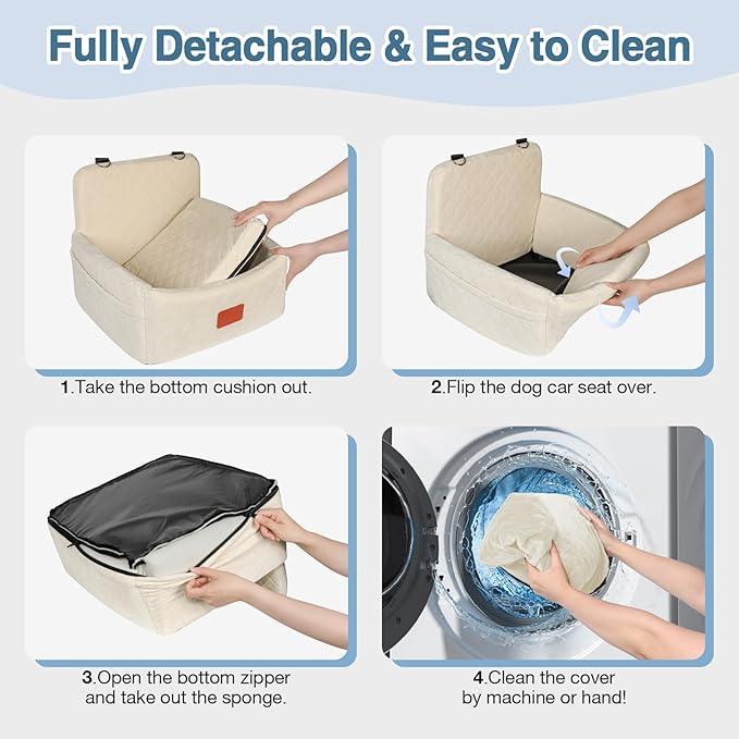Dog Car Seat for Under 30lbs Dogs,Comfy Febric Fill in Memory Foam,Washable and Detachable Pet Travel Car Bed,Anti-Slip Bottom,2 Safety Leashes & Storage Pockets(Beige)