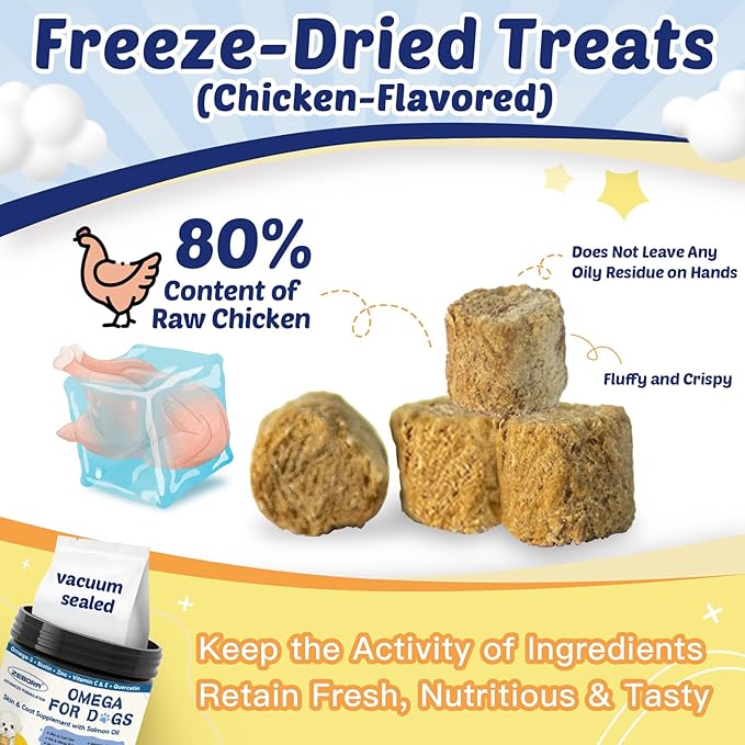 - SUPERIOR TO SOFT CHEW OPTIONS: The chew is good alternative to liquid fish oil. Compared with the common soft chews on the market, we offer a superior choice. Utilizing freeze-drying technology, we remove all moisture to better preserve nutrients and flavors, making it less susceptible to spoilage or mold, and don't leave any oily residue on the hands when handling to your dogs. Additionally, we package in aluminum foil bag, keep it from air, moisture, heat, and light. No need to refrigerate