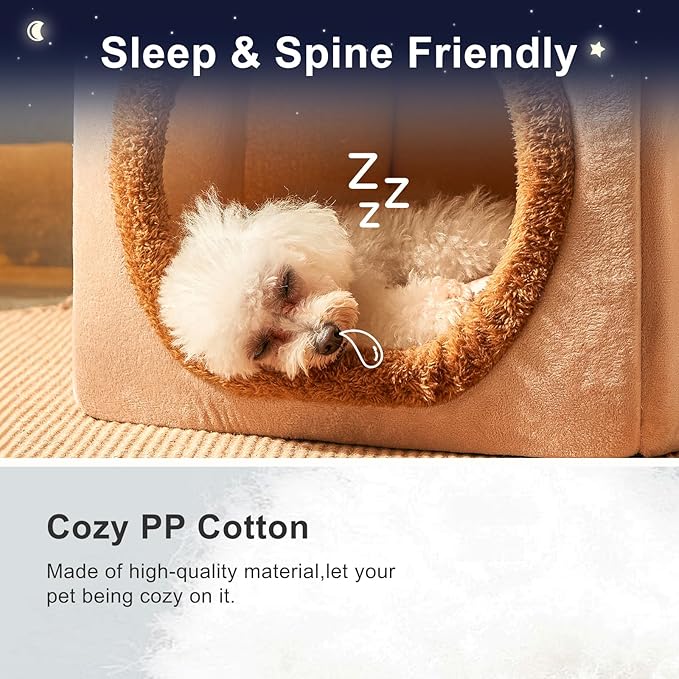 JIUPETY Cute Small Dog House Indoor, Foldable House Kennel Bed Mat with Cushion, L Size Tent Up to 25 Lbs, Dog Cave Bed with Non-Slip Bottom, Brown