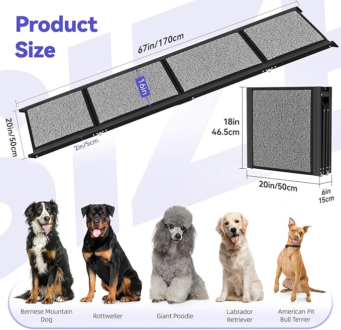 - 【Upgrade Wider & Longer Pet Ramp】 Our dog ramp for car is 67in long and 20in wide (non-slip PVC mat is 16in wide) with a gentle angle, perfect for older, disabled or injured dogs to easily get in and out of cars, SUVs, trucks, etc., and is equally suitable for indoor climbing on high beds, sofas, window sills and more.