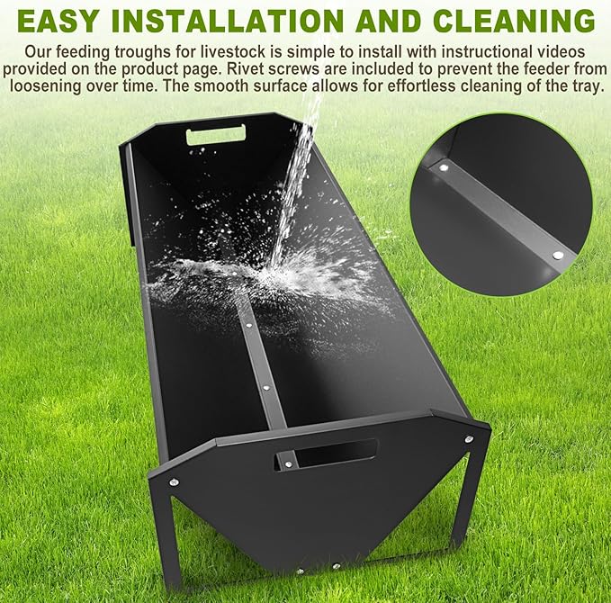 - 【Easy Installation and Cleaning】- Our feeding troughs for livestock is simple to install with instructional videos provided on the product page. Rivet screws are included to simplify installation. The smooth surface allows for effortless cleaning of the tray