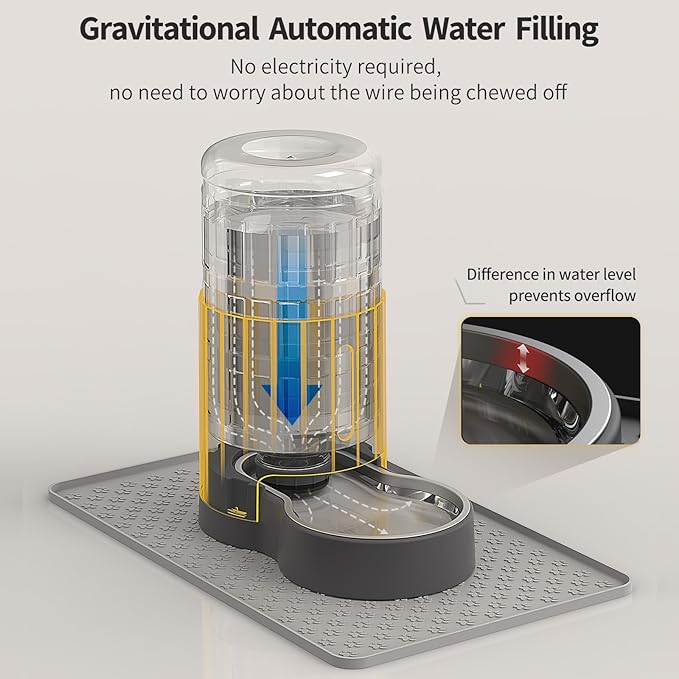 - Gravity Automatic Refill & No Leakage - This pet waterer uses gravity to fill the water on its own, no electricity required, so you don't have to worry about the cord being chewed. The gravity water bowl for cats will automatically stop filling to prevent overflowing when the water in the base reaches a specific height.