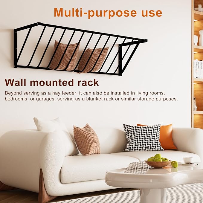 - Versatility: Not only can it be used as a hay feeder, it can also be installed in the living room, bedroom or garage to be used as a blanket rack or similar storage purposes.